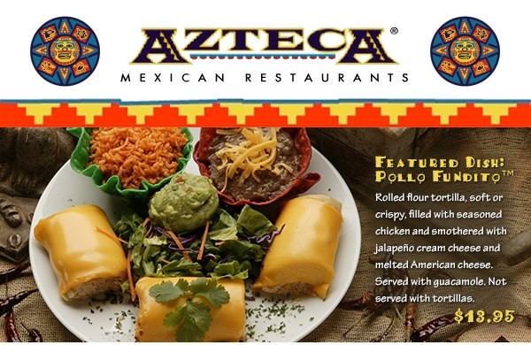 Home - Azteca Mexican Restaurants For over 45 years, Azteca has made it a priority to provide our guests, our families, a safe place to come and enjoy a wonderful Mexican meal. Here at Azteca, we know everyone is concerned right now, and nothing is more important to us than the health and wellness of our customers and staff. Whether you decide to order takeout or delivery, rest ...