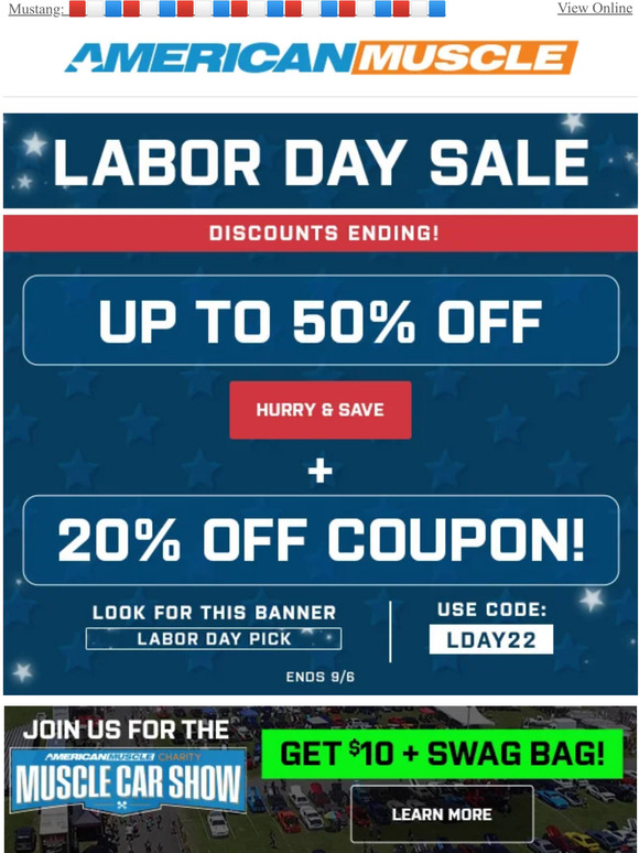 AmericanMuscle Coupons & Promo Codes | October 2022 - Slickdeals Get $10 Off Orders $299+ with Promo Code. 1 Used Today. Get Coupon Code. Use this code at checkout and save $10 on orders over $299. One coupon code may be used per order. Coupon codes cannot be combined or used with other offers or promotions. This promotion cannot be applied to past orders. Add Deal Alert for AmericanMuscle.